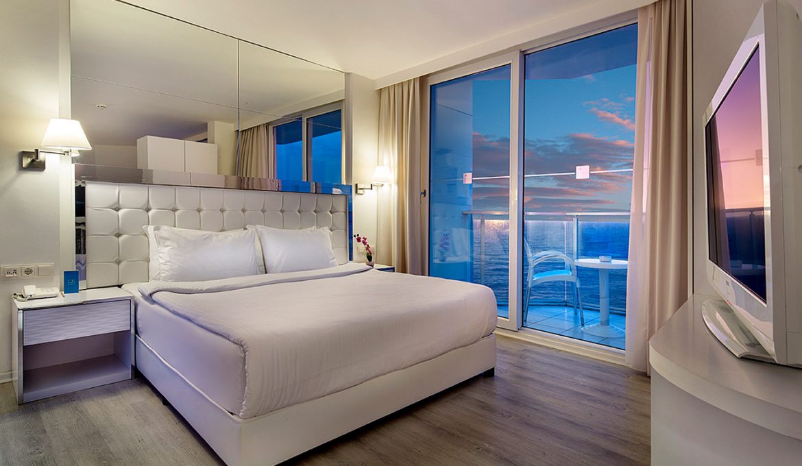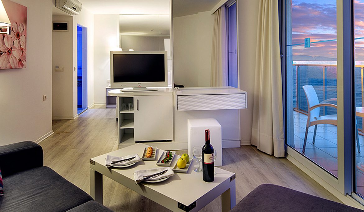 All junior suites at Le Bleu Hotel & Resort are especially decorated for the comfort and convenience. Junior suites are also eligible for families for their spacious area and are ideal for families with children. You will feel yourselves unique and special while watching the sunset from your room on the background of a spectacular Aegean view. You will absolutely enjoy an always-to-remember view on a spacious balcony in the company of your family.
